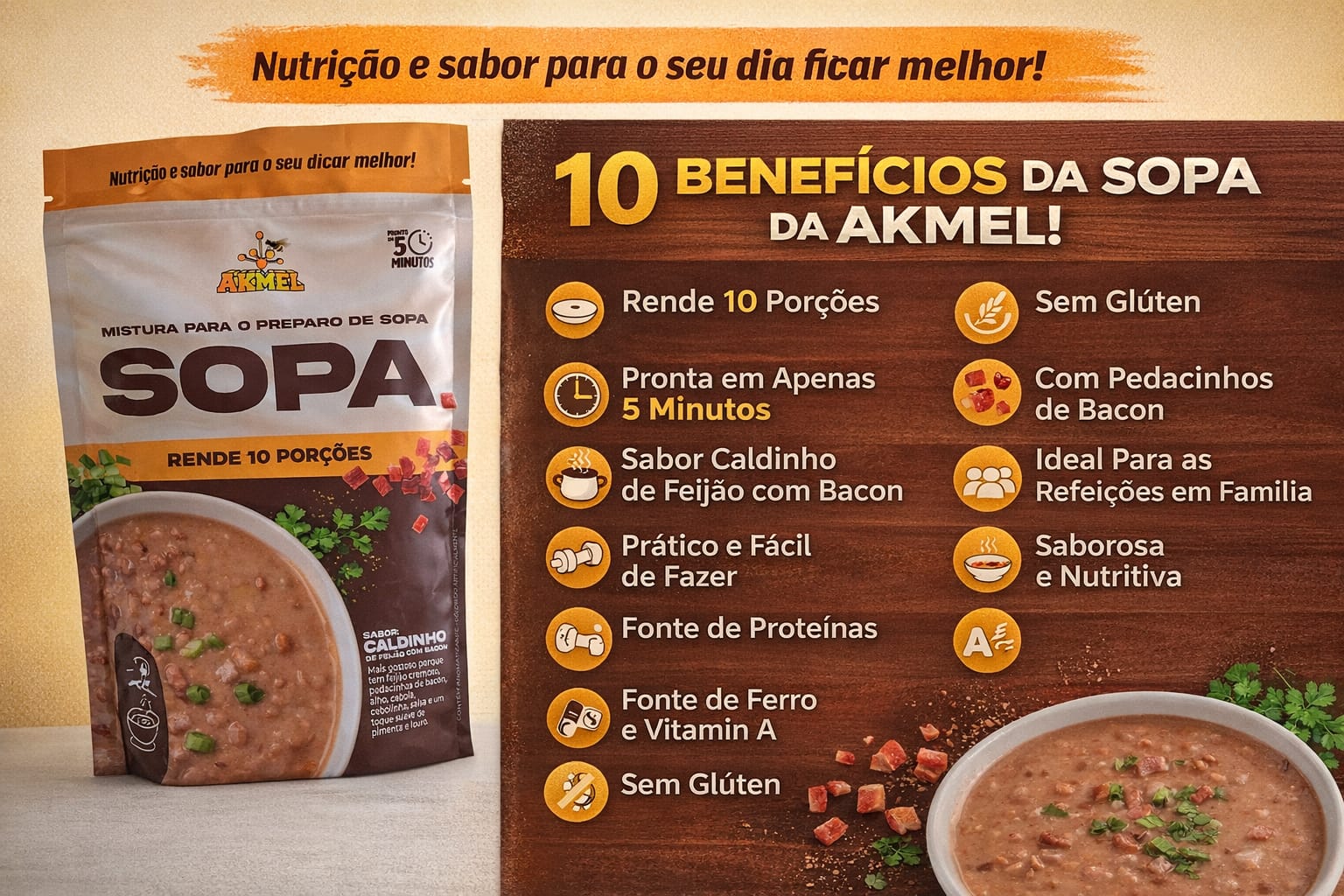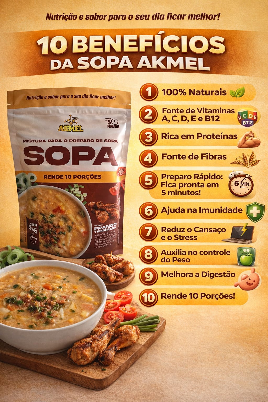 Benefícios Vitaminas do complexo B que, (melhoram o metabolismo), atuando no sistema nervoso, contribuindo para a melhora da memória e, concentração para reduzir a ansiedade. Vitaminas A, C, D, E (ação antioxidante e anti-inflamatória), que ajudam na diminuição de gorduras, aumento da disposição e combate aos radicais livres; Sais minerais (ácido fólico, potássio, manganês, zinco, iodo, ferro, cobre, cálcio, fósforo, selênio, magnésio e cromo), que são importantes componentes na formação e na manutenção dos ossos e dentes, e, também no equilíbrio das funções enzimáticas do nosso corpo. Regulador do trânsito intestinal que ajuda a eliminar as toxinas do organismo reduzindo o inchaço abdominal e deixando a silhueta mais sequinha; Auxilia na composição de massa magra (músculos). Sugestão de uso: Para preparar uma porção, adicione 3 colheres de sopa (aproximadamente 30 g) em 250 ml de água ou leite integral ou leite desnatado. Bata preferencialmente no liquidificador ou misturador. Recomendação; Tome de 1 a 2 porções divididas ao longo do dia, no intervalo das principais refeições. Para emagrecer: substituir uma ou duas das principais refeições por um copo de Shake Akmel Rendimento de 10 porções